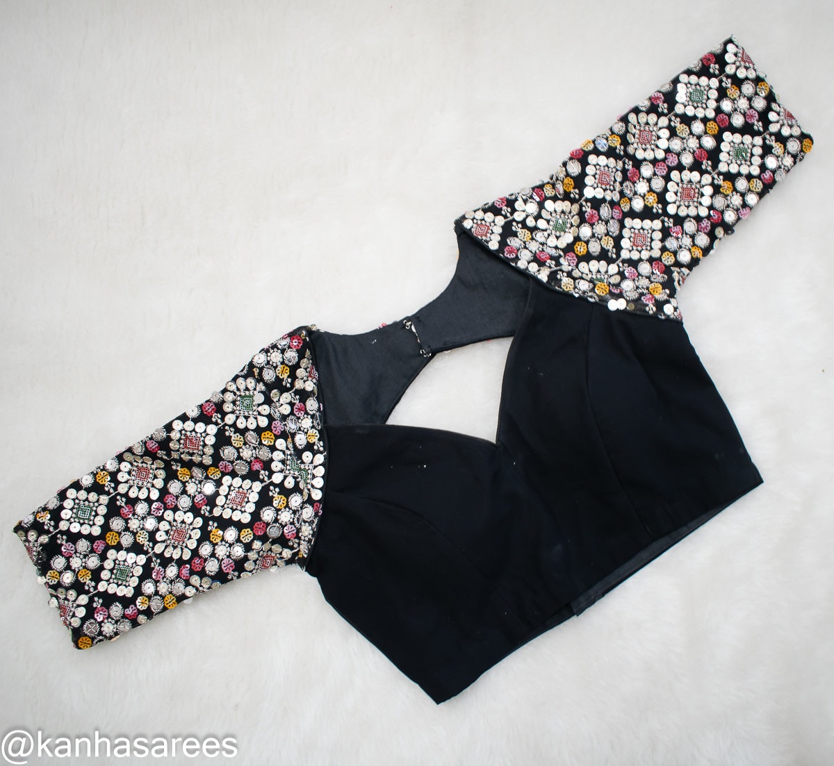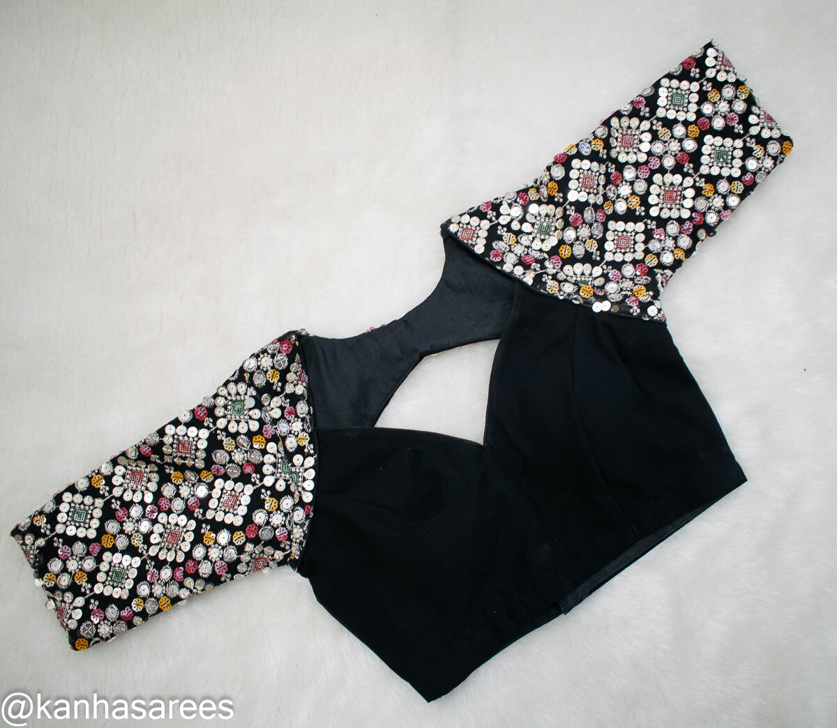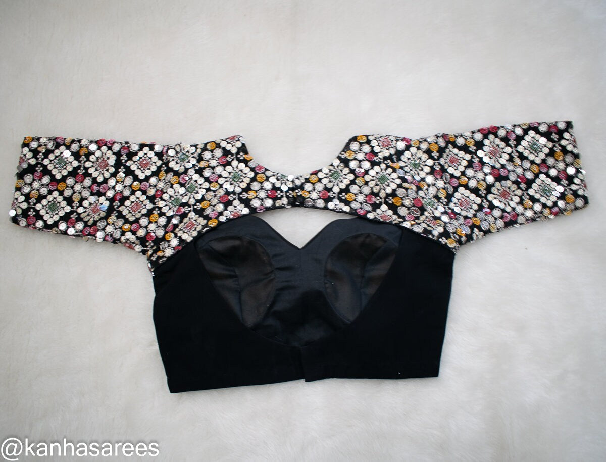 Elevate your ethnic look with our Black Mirror Work Saree Blouse, featuring meticulous mirror work that shimmers beautifully. This half-sleeve, back-open design offers a blend of tradition and modern flair. Perfect for Indian weddings and ethnic functions, each blouse is customizable to ensure the perfect fit. Handcrafted with care, this blouse brings authentic elegance to your saree ensemble, making you feel effortlessly stunning and comfortable. Shop now for a piece that speaks to timeless Indian craftsmanship!Transform your look with our stunning black saree blouse adorned with intricate mirror work. Designed for Indian weddings, functions, and parties, this blouse offers a blend of traditional elegance and modern style.