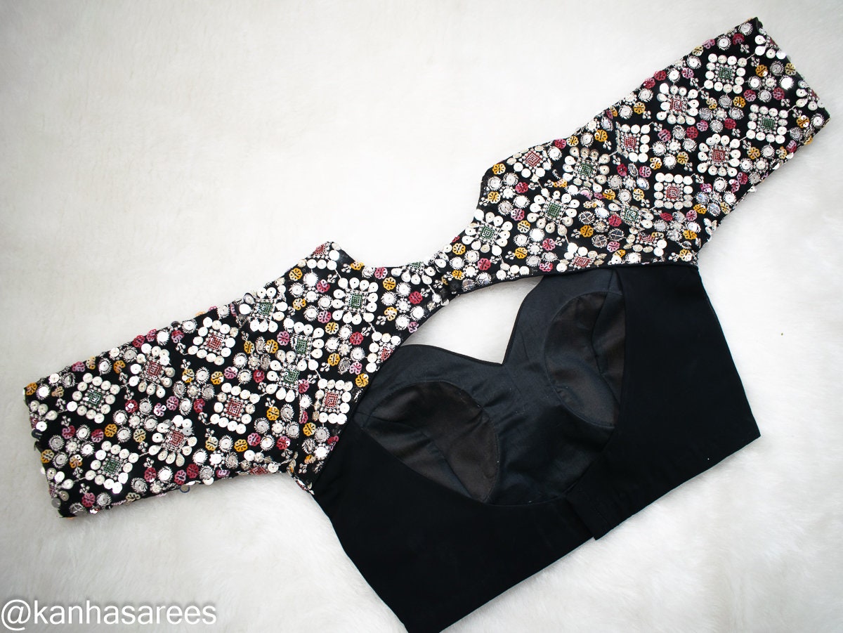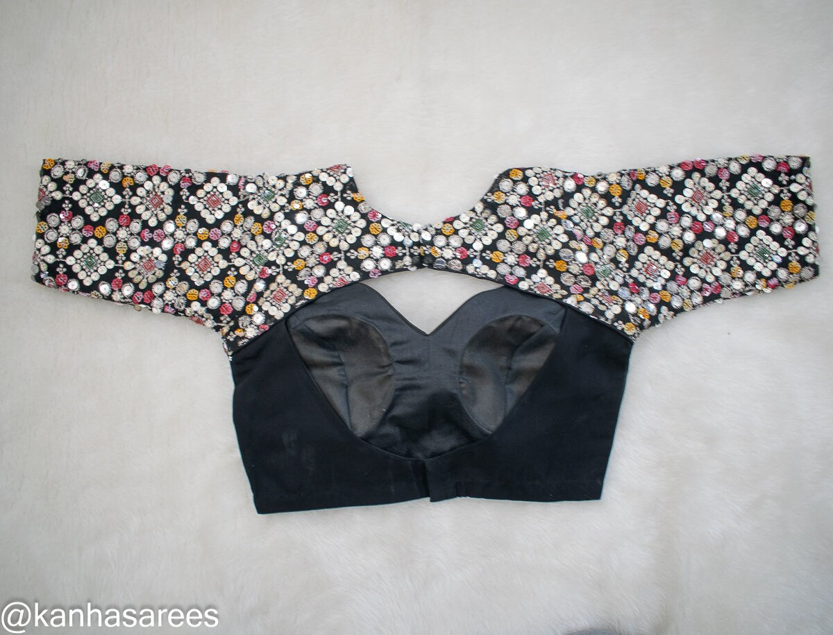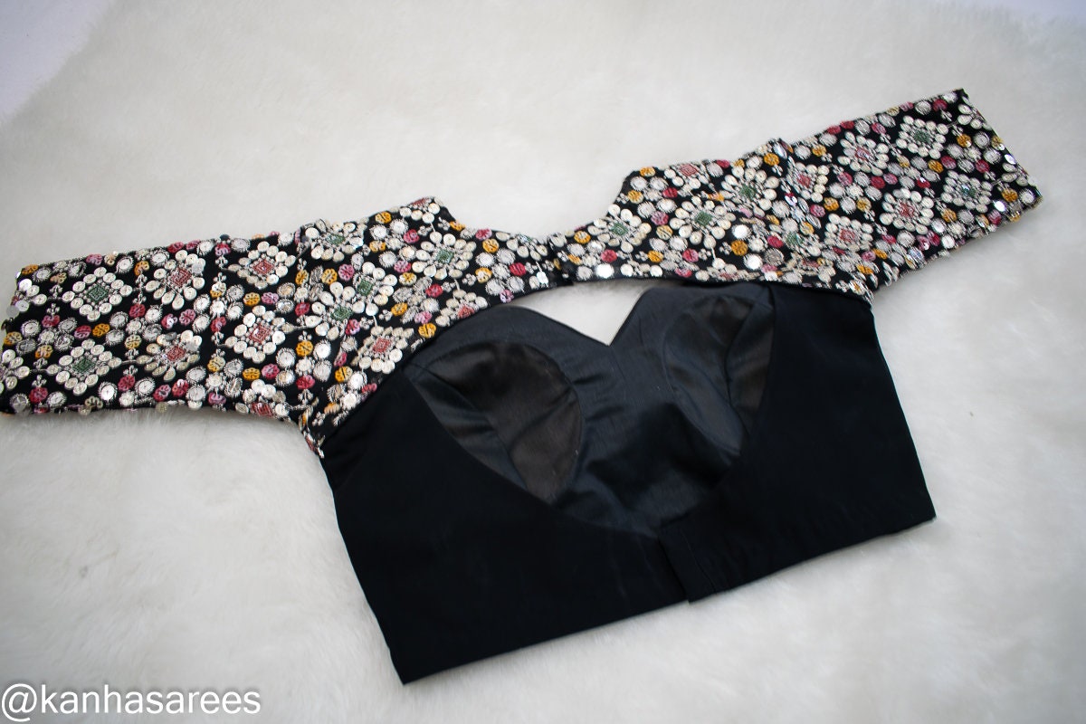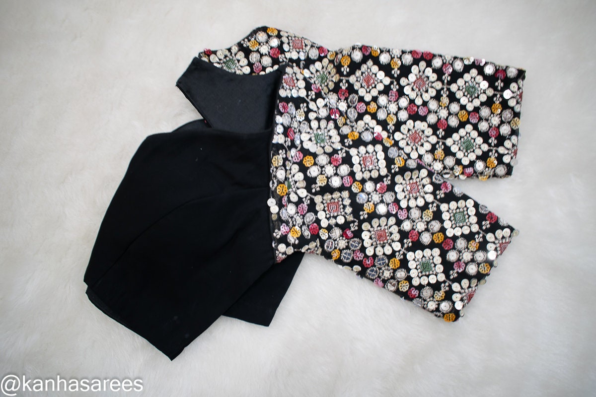 Elevate your ethnic look with our Black Mirror Work Saree Blouse, featuring meticulous mirror work that shimmers beautifully. This half-sleeve, back-open design offers a blend of tradition and modern flair. Perfect for Indian weddings and ethnic functions, each blouse is customizable to ensure the perfect fit. Handcrafted with care, this blouse brings authentic elegance to your saree ensemble, making you feel effortlessly stunning and comfortable. Shop now for a piece that speaks to timeless Indian craftsmanship!Transform your look with our stunning black saree blouse adorned with intricate mirror work. Designed for Indian weddings, functions, and parties, this blouse offers a blend of traditional elegance and modern style.