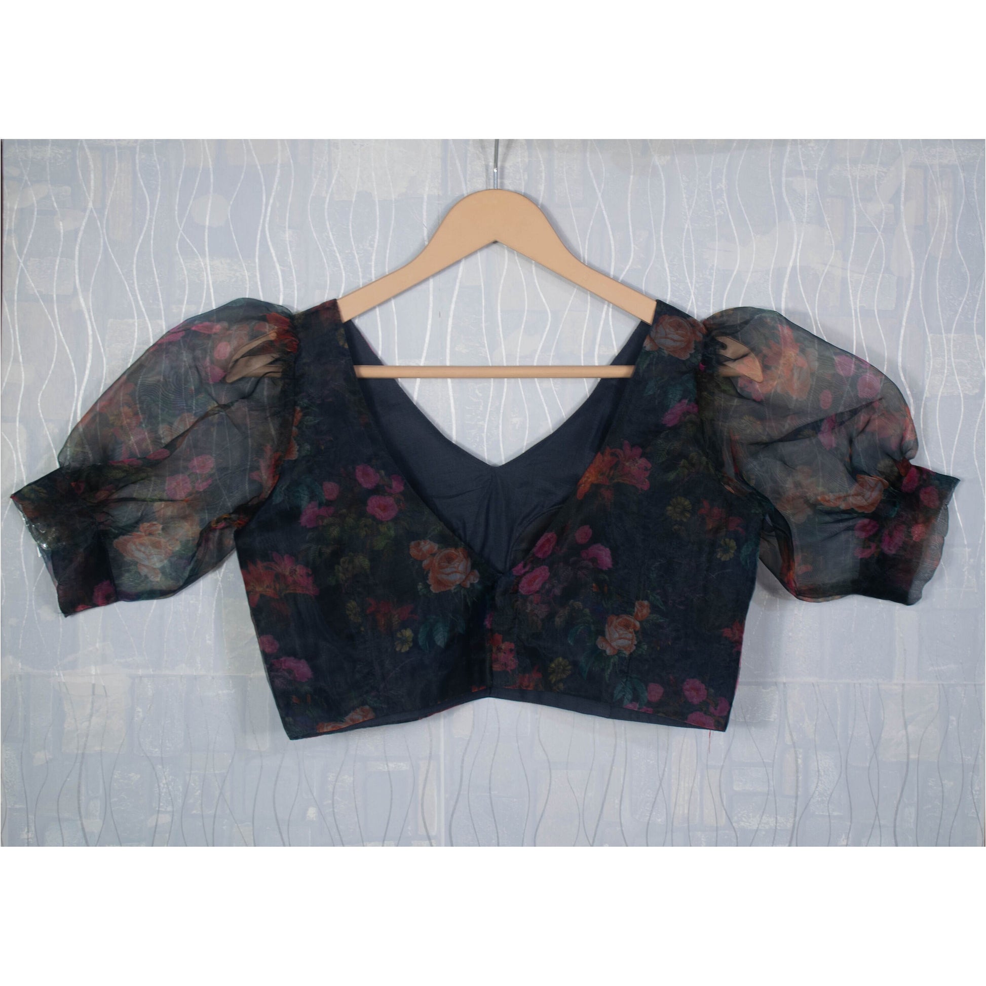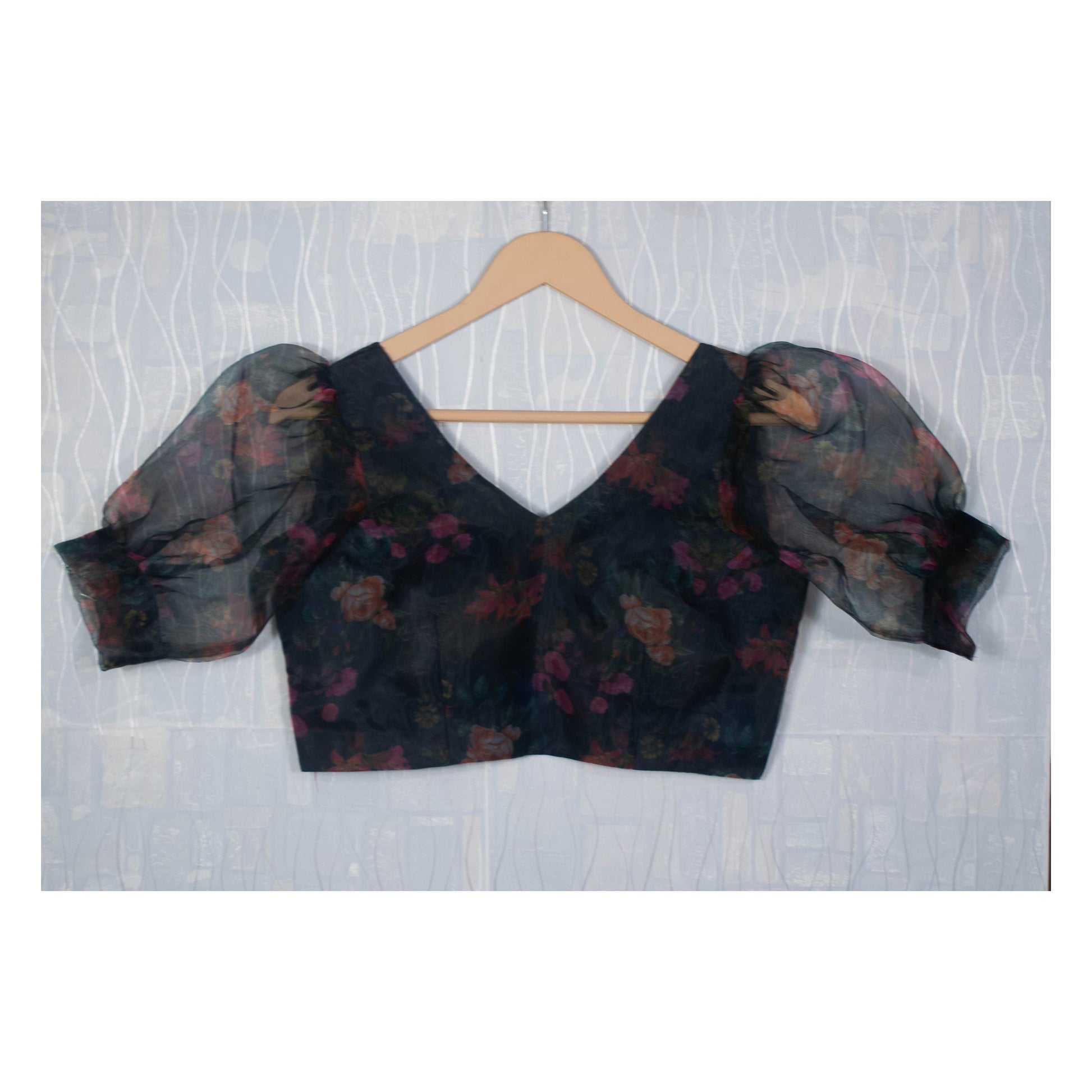 Custom Organza Saree Blouse Flower Print Puff Sleeves Blouse V Neck sari top Back Open blouse Made to Order