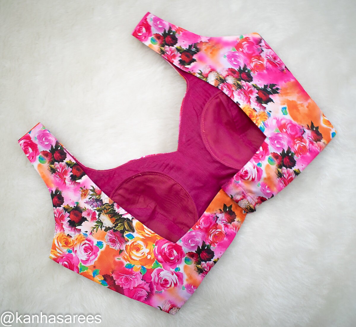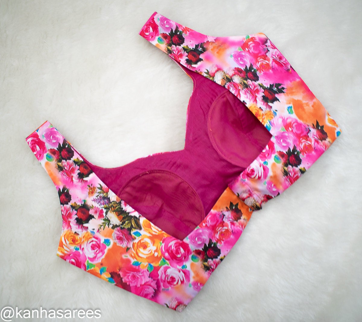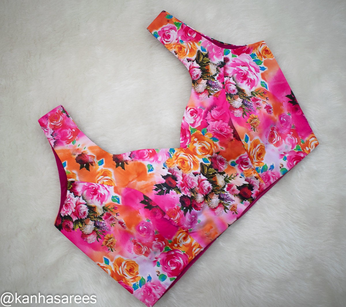 Made to order Art Silk Blouse with Flower Print - Back Open, Sleeveless , Princess cut Floral blouse - Ideal for Indian Functions Parties
