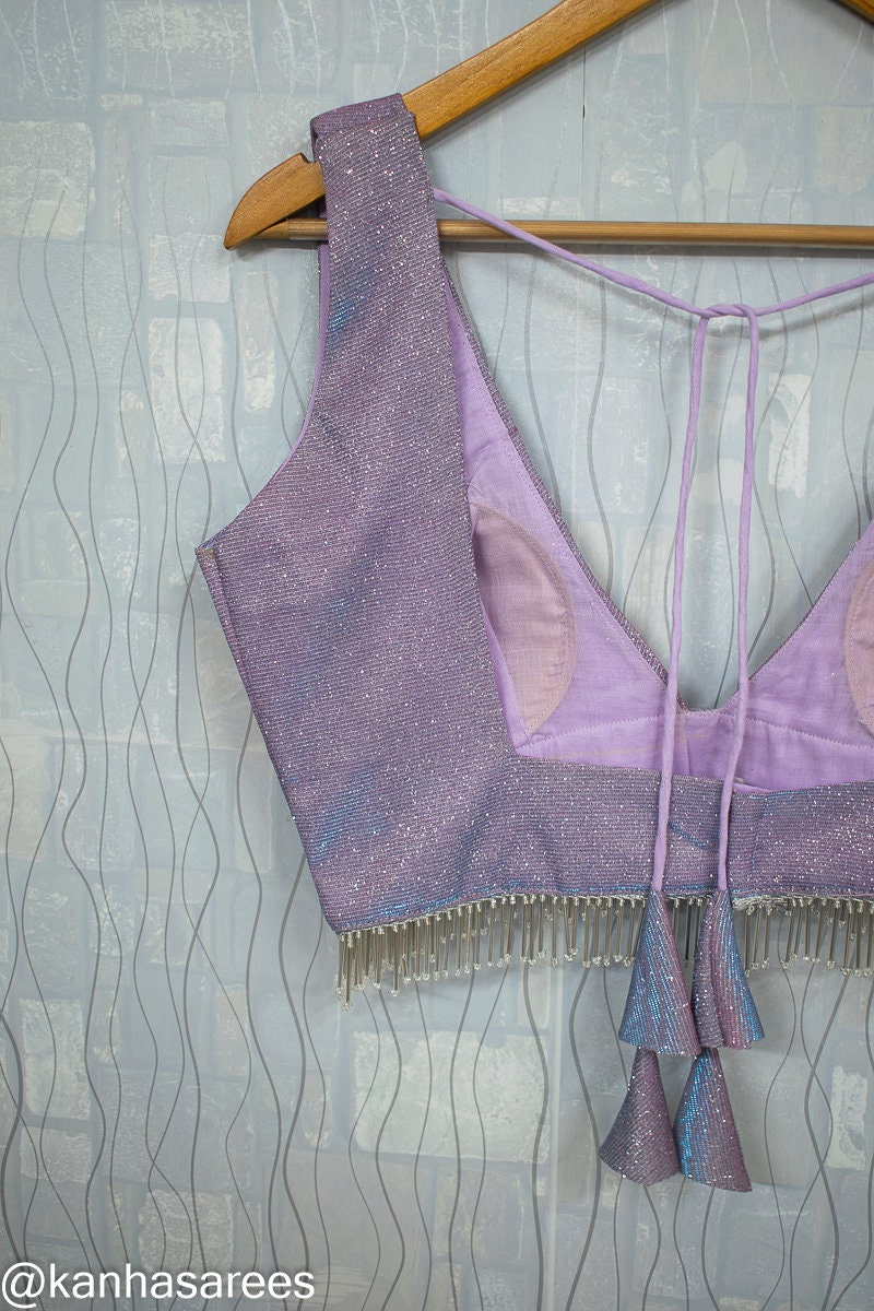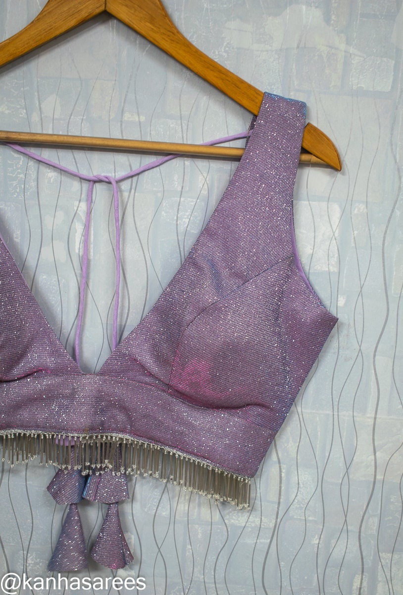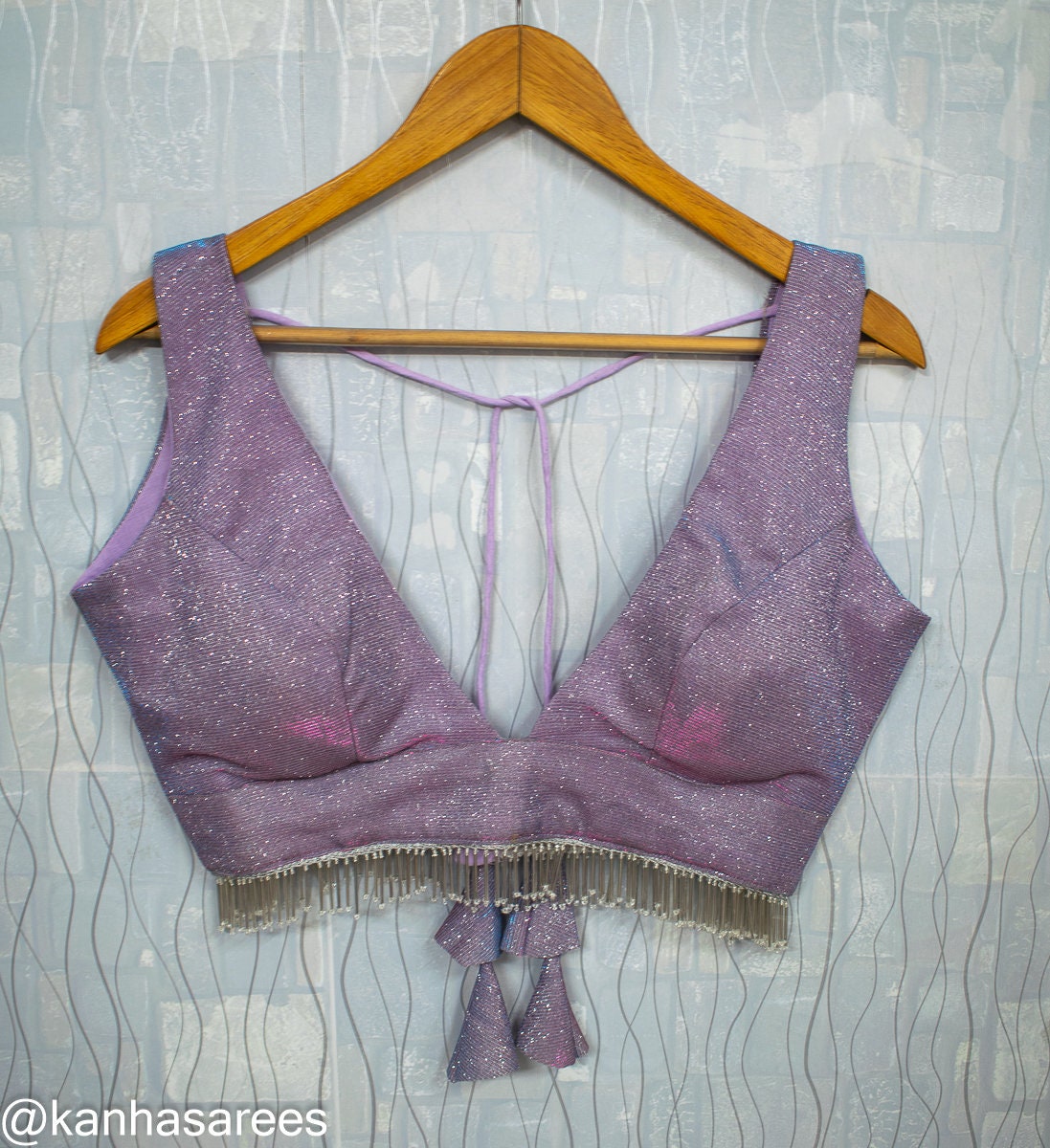 Deep plunge blouse Light Purple Designer Silk Shimmer Glitter Blouse with Deep V Neck, Sleeveless with Dori Tassels, Bollywood Choli for Indian Ethnic Wear