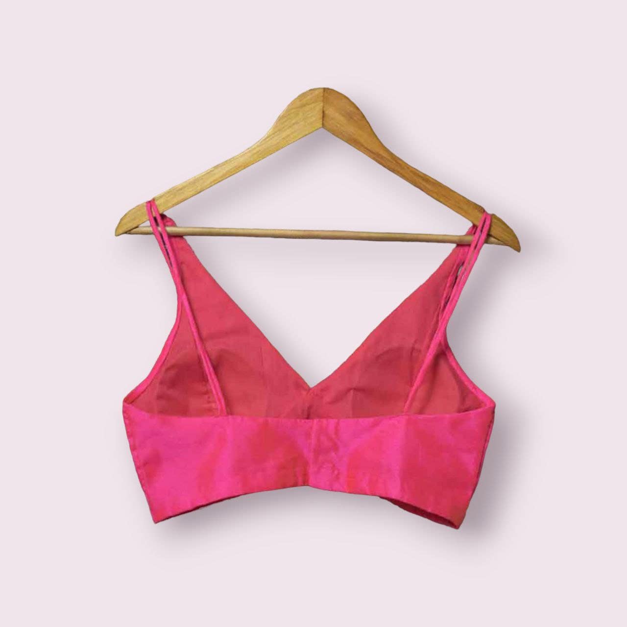 Embrace elegance with our Pink Silk Saree Blouse ! This readymade, padded sleeveless crop top features a V-neck and sweetheart design, perfect for any saree. Crafted from luxurious silk, it offers both comfort and style for any ethnic occasion. Elevate your wardrobe with this authentic designer piece today!Introducing our exquisite Pink Indian Sari Blouse, a perfect blend of tradition and contemporary style. This readymade blouse is designed for the modern woman who appreciates elegance with a touch of glamour. Here are the key features that make this blouse a must-have: