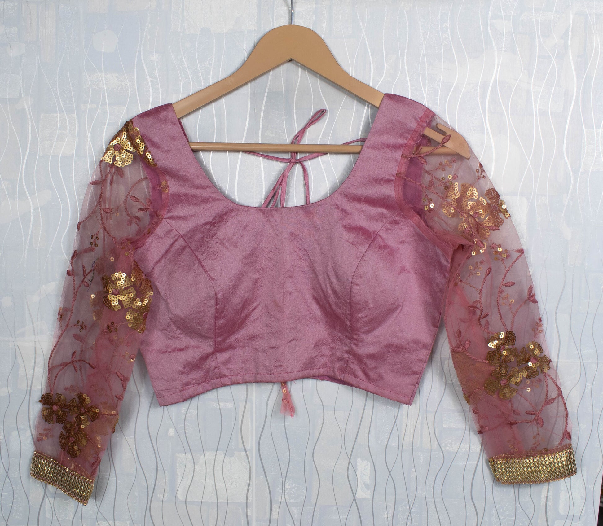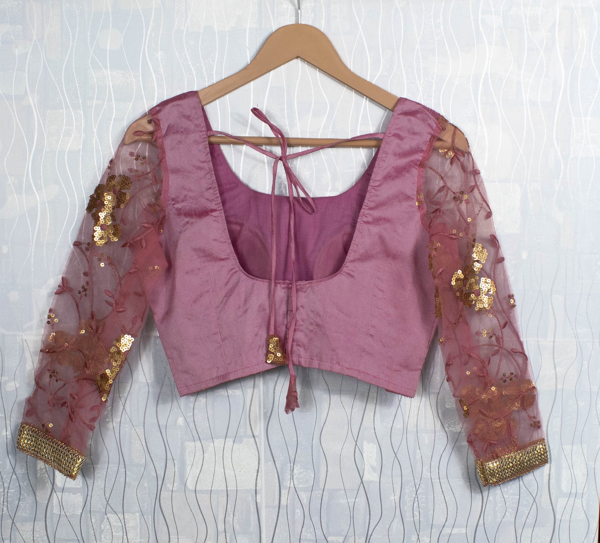 Raw Silk Round Neck Blouse, Back Open, Padded with Dori & Tassels, Full-Length Sequin Net Sleeves, Gold Lace Trim