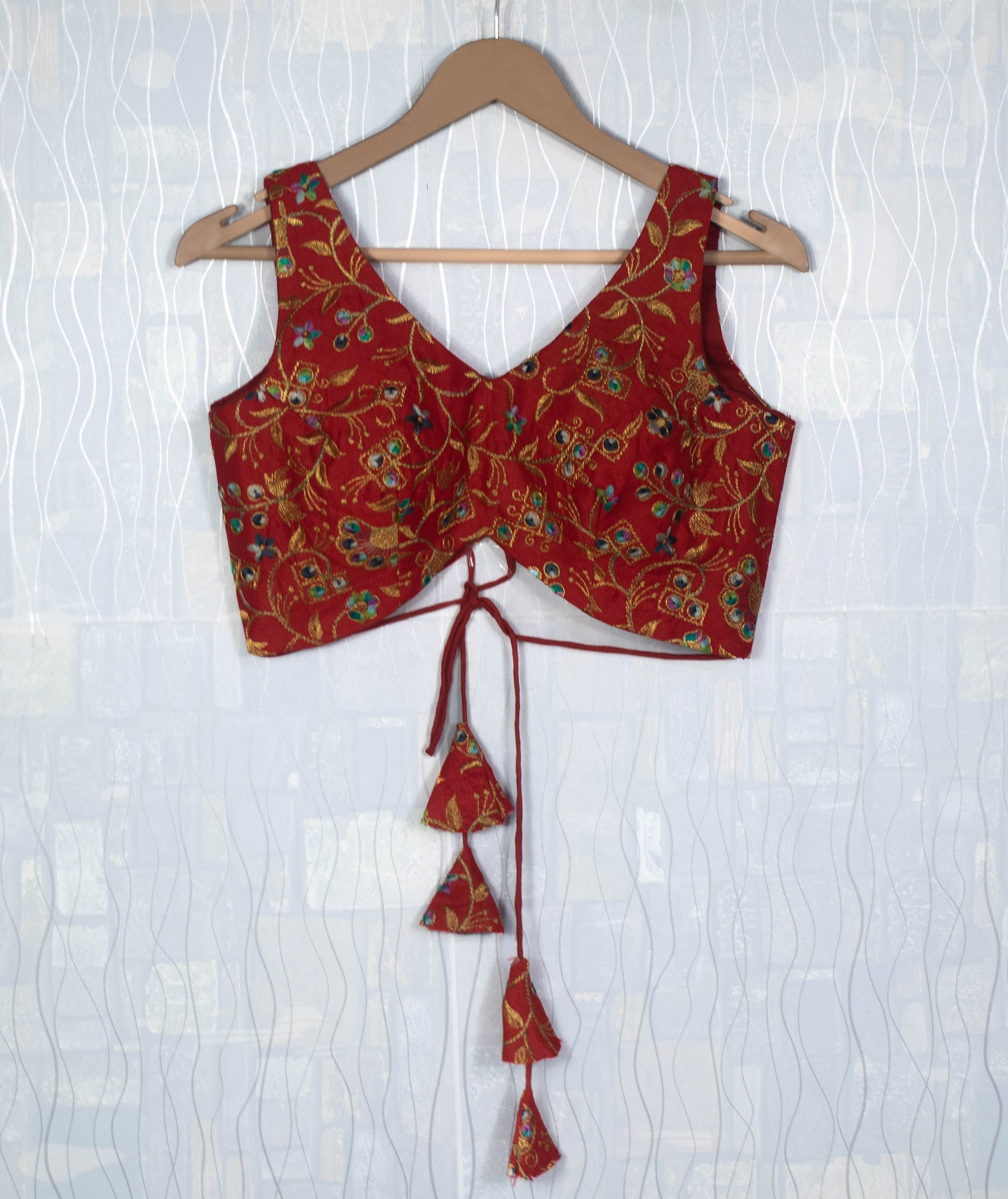 Red Embroidered Sleeveless Blouse for Saree or Lehenga - Custom-Made